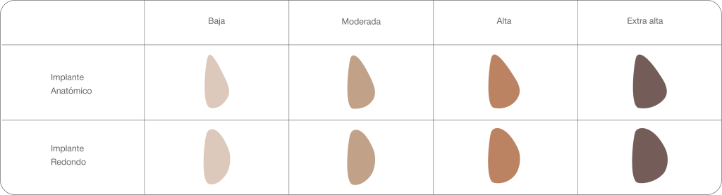 Baja: Estos implantes tienen un perfil ancho y bajo, ofreciendo una apariencia sutil y natural, ideales para quienes buscan una mejora moderada en el volumen.